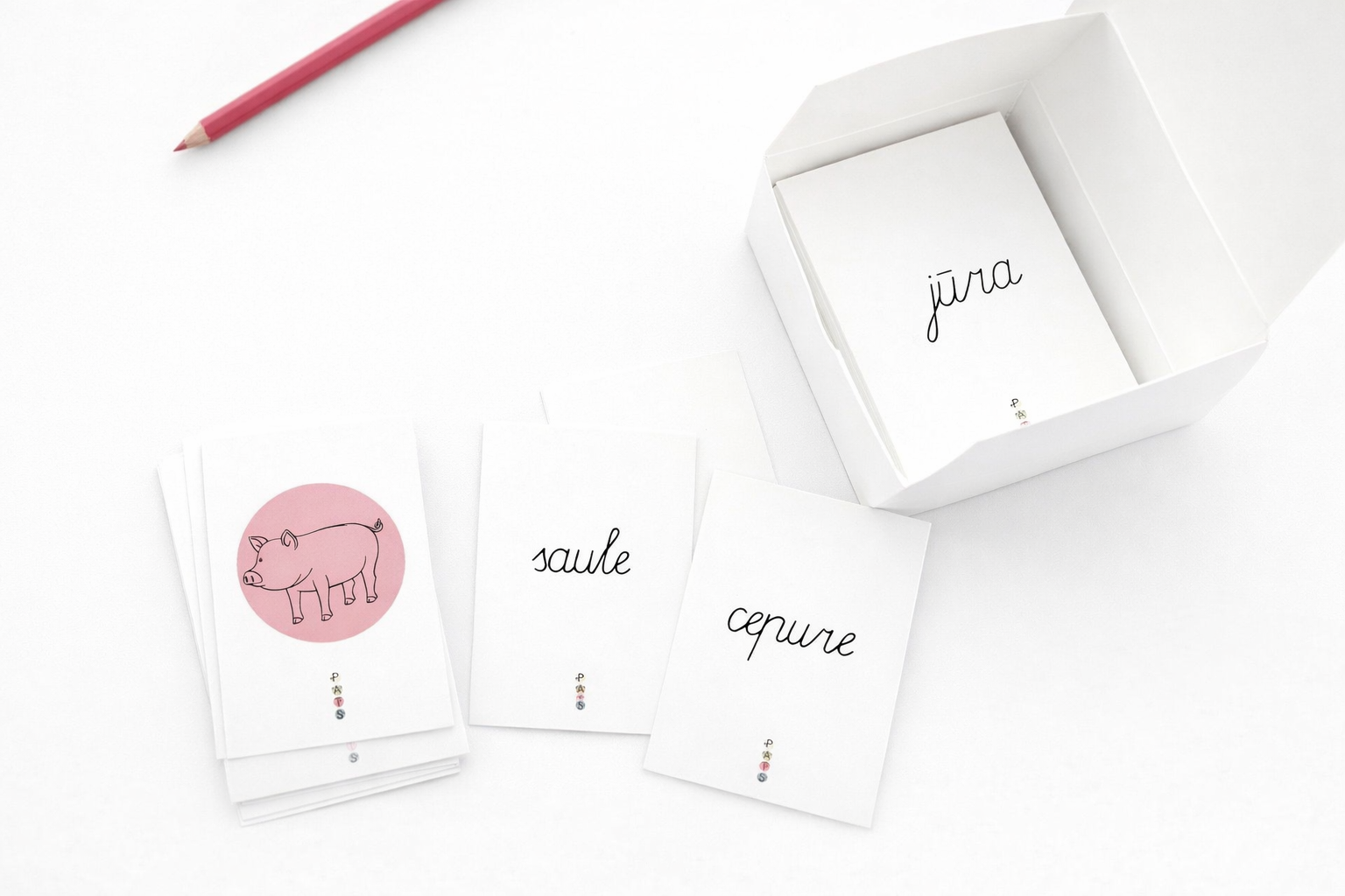 - 107 kartiņas ar drukātiem burtiem, kurām vienā pusē vārds un otrā pusē attēls