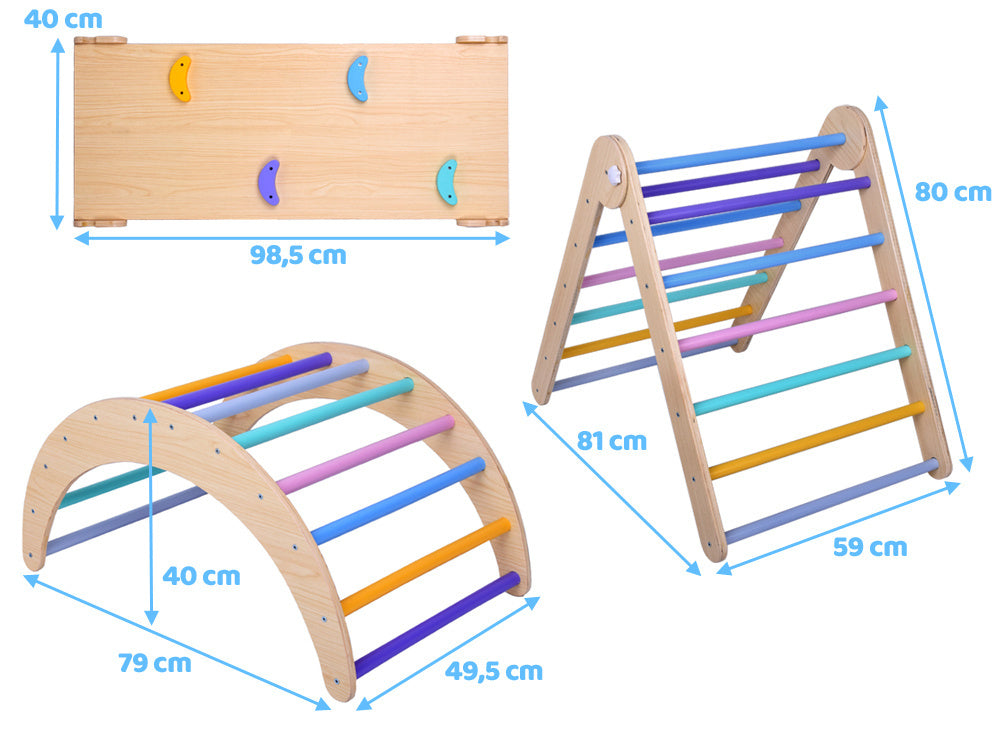 Montessori kāpšanas komplekts piedāvā plašu aktivitāšu klāstu – kāpšanu, slīdēšanu un šūpošanos. Kāpšanas trijstūri, arku un rampu var izmantot kopā vai atsevišķi, pielāgojot grūtības līmeni bērna vecumam un prasmēm. Augstas kvalitātes apdare un droši materiāli garantē ilgu lietošanas laiku un maksimālu apmierinātību.